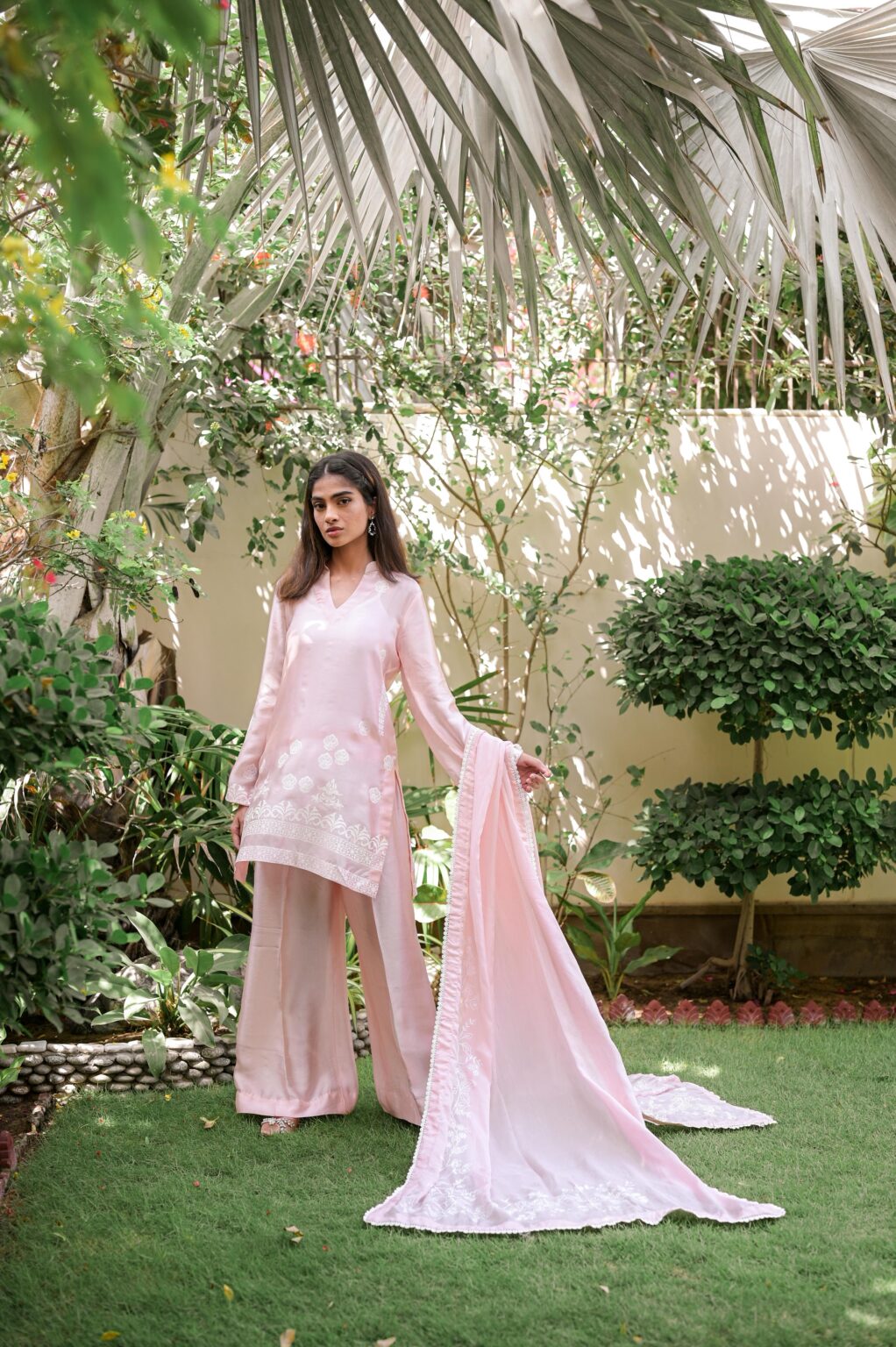 Crafted on pure shisha silk, this three-piece set features a short shirt with matching plazo pants — both front and back block printed. Paired with a soft silk dupatta, finished with block-printed borders and delicate lace detailing.